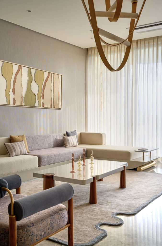 A well-proportioned sofa, a thoughtfully placed console, or a sculptural coffee table can define the living room’s rhythm. We often prefer fewer, well-crafted pieces over many smaller elements. This approach creates visual clarity and allows movement to feel uninterrupted. Standing lamps, side tables, and lounge chairs are treated as part of the architectural composition rather than add-ons.